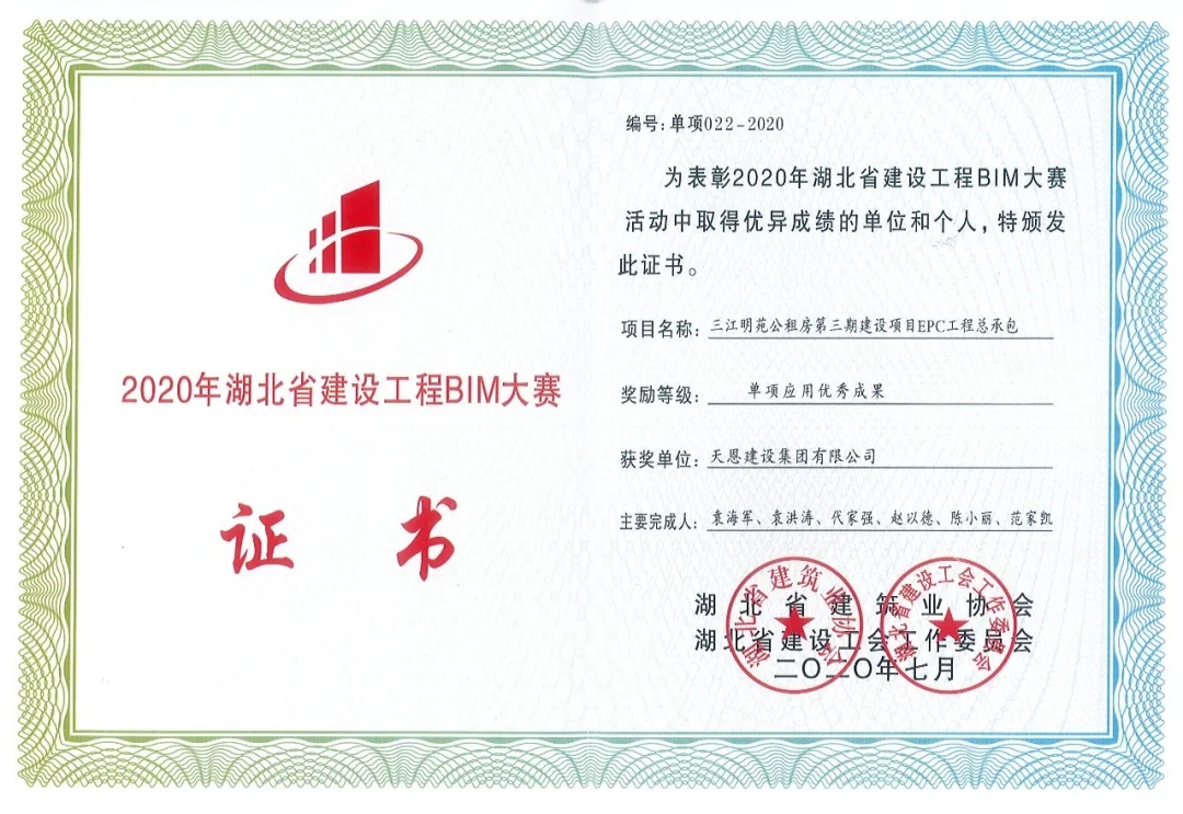 為深入貫徹落實國家建筑業信息化發展戰略和住建部的有關精神,加快推進 BIM 技術廣泛應用。近日,湖北省建筑業協會和湖北省建設工會工作委員會共同舉辦了2020年湖北省建設工程BIM大賽。經過專家組按照既定評審程序,由天恩建設集團有限公司申報的三江明苑公租房第三期建設項目(EPC工程總承包)獲得” BIM 單項應用類”優秀成果獎。